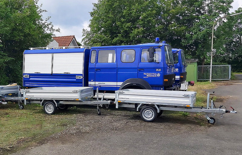 Um die Flutkatastrophe zu bewältigen zählt jede helfende Hand. Jedes Fahrzeug und jede Transportmöglichkeit trägt einen großen Teil dazu bei, das verheerende Bild zu beseitigen. Wir möchten den Einsatzkräften und Helfern vor Ort unter die Arme greifen und spenden 4 HU Anhänger. Das Besondere: die Anhänger werden zu Spezialanhängern umgebaut. Mit rund 1010 kg Nutzlast können die Anhänger optimal auf ihren Einsatz angepasst werden. Denn auf dem ca. 1380 mm breiten und 2300 mm langen Plateau werden Notstromaggregate und Pumpen montiert. Durch die abklappbaren Bordwände können die Anhänger aber auch für Aufräumarbeiten genutzt oder mit weiterer Ausstattung bestückt werden.