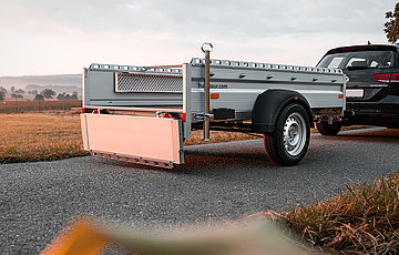 Aber das ist noch nicht alles. Besonders robust und langlebig wird der Pkw-Anhänger durch die im Tauchbad feuerverzinkte V-Zugdeichsel. Die sorgt zudem für ein stabiles Nachlaufverhalten. Natürlich ist der Anhänger mit einem 13-poligen Stecker mit Rückfahrleuchte versehen. Damit wird die im Unterfahrschutz integrierte Multifunktionsbeleuchtung mit Strom versorgt. Die Bordwände sind aus eloxierten, doppelwandigen Aluminiumprofilen gefertigt. Die Klappen sind dabei mit versenkten Verschlüssen ausgestattet. Das sieht nicht nur gut aus, sondern ist auch platzsparend und verringert das Verletzungsrisiko.