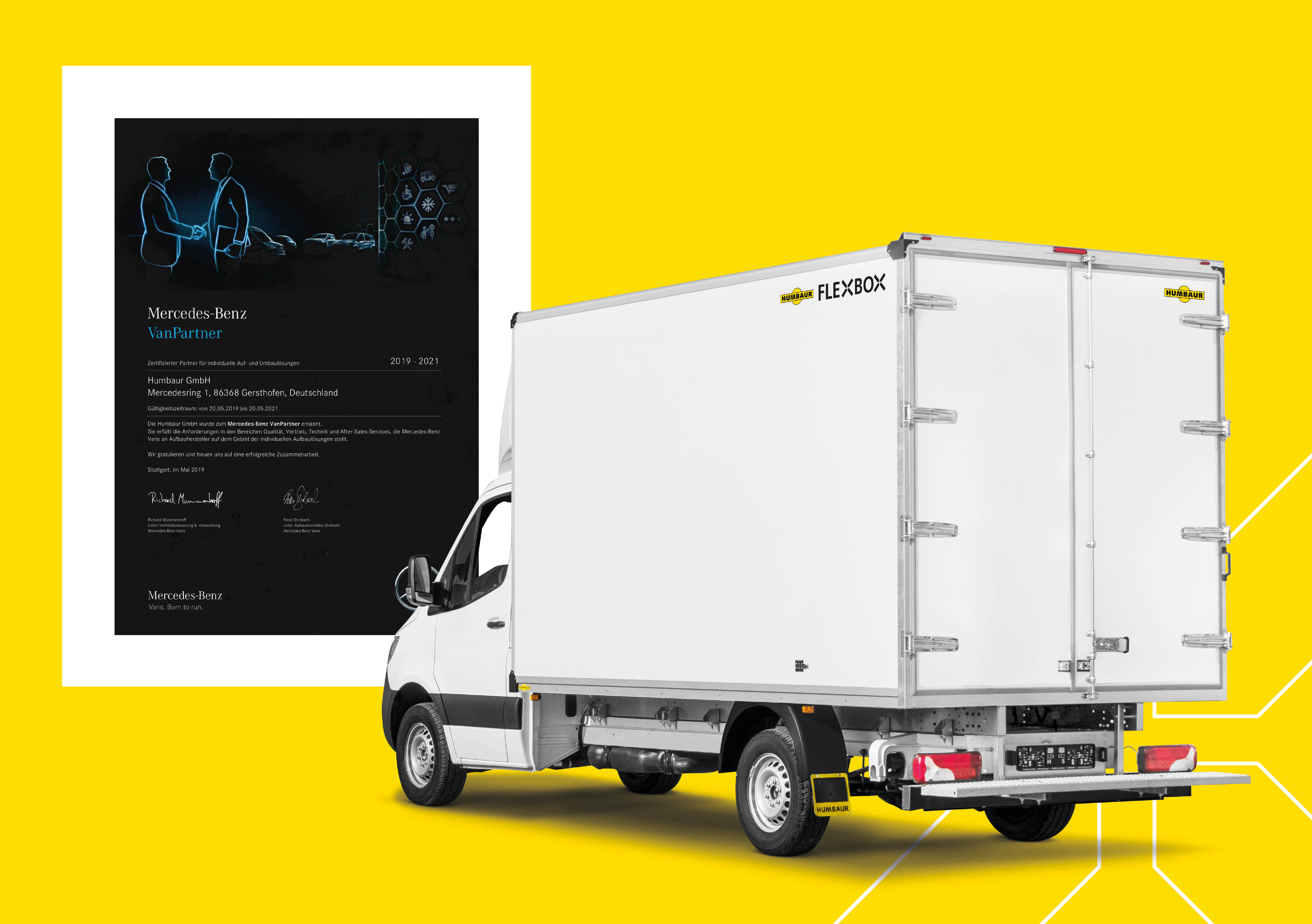 „Wir freuen uns, dass wir Mercedes-Benz Vans als weiteren Nutzfahrzeughersteller von unseren Produkten und unseren Services überzeugen konnten“, sagt Markus Wiedemann, Vertriebsleiter Kofferaufbauten bei Humbaur. „Unsere FlexBox-Fahrzeugaufbauten sind optimal auf die Fahrzeuge darunter abgestimmt und wir sind stets bestrebt, Markenqualität zu liefern, die allen Ansprüchen gerecht wird.“