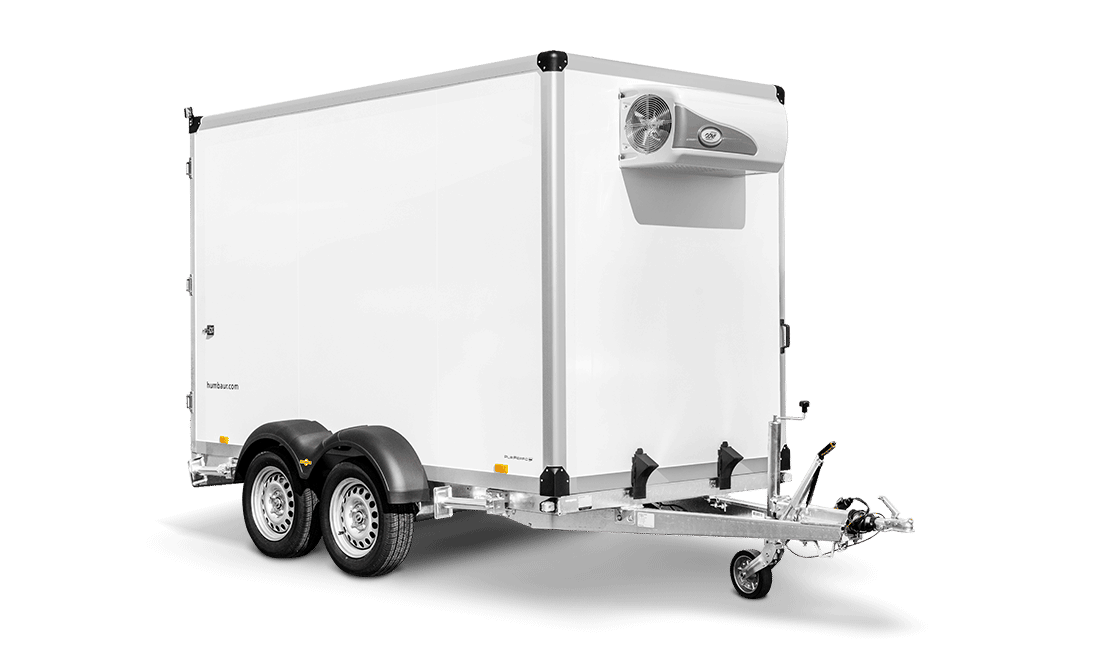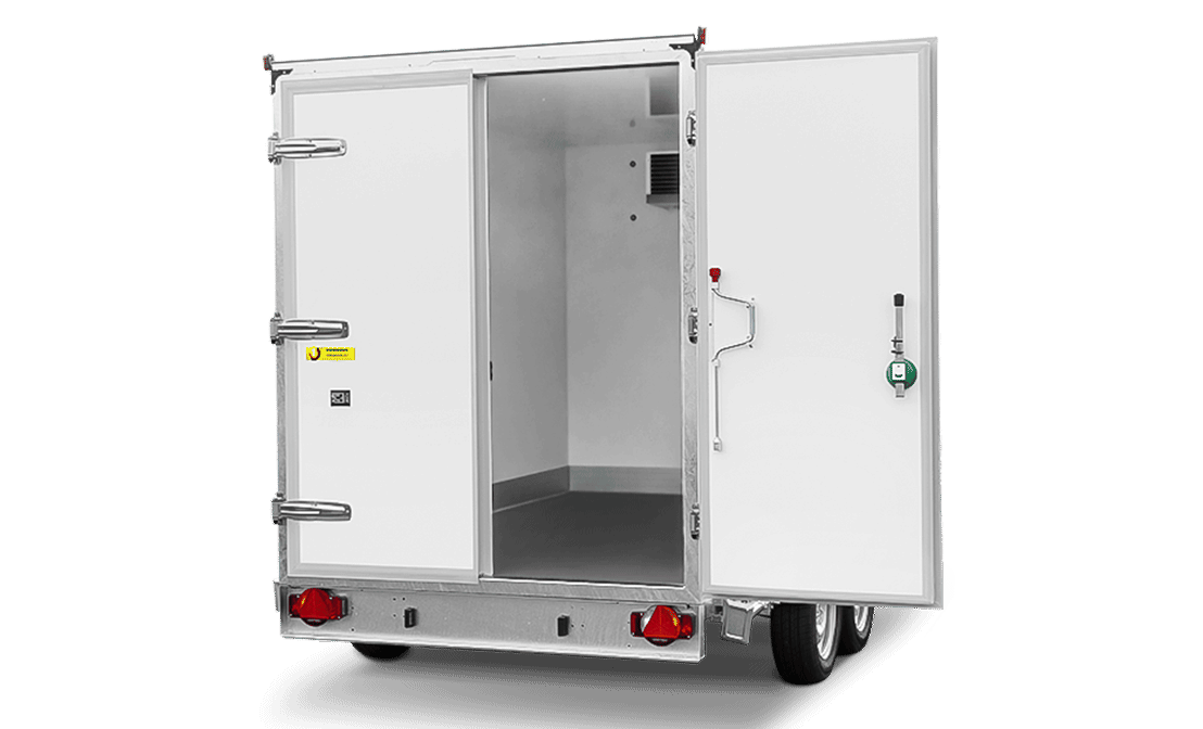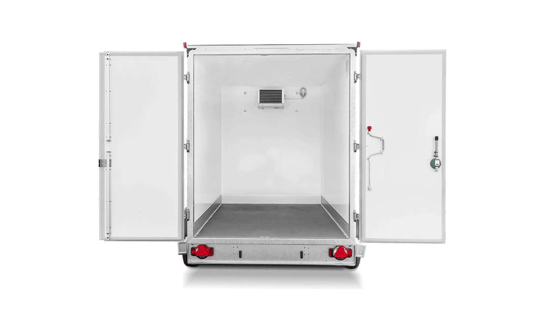 The cooling trailers in the HGK Deluxe Tandem series offer everything you need to safely transport chilled goods: The cooling cell is constructed from 60-mm-thick PurFerro sandwich panels consisting of a polyurethane foam core with outer layers made of galvanised and powder-coated sheet steel. The 65-mm-thick insulated floor is equipped with an anti-slip coating that ensures safe loading and unloading, with the higher frictional resistance also helping to secure loads. This floor is optimally insulated and does not allow any of the cold to escape downwards. The double-wing refrigerator doors are lockable, but can always be opened from the inside in an emergency. They are connected to the trailer structure via stainless steel hinges. A 150-mm-high scuff plate made from sleet aluminium is attached to the inner walls. The frame and chassis are made of hot-dip galvanised steel, as is the welded rear portal. Four swivelling telescopic crank supports allow the car trailer to be safely parked. The bezels on the HGK Deluxe Tandem are made of anodised aluminium, as is the rear rain channel. You will find the right tandem-axle cooling trailer to meet your every need: Models with a total permissible weight from 2000 kg to 3500 kg are available; the load capacity varies from 1329 kg to 2229 kg and the loading height varies from 590 to 630 mm, both depending on the model. The cooling unit is from the well-known Govi brand and allows a temperature in the cooling trailer from +2øC to +10øC. The cooling unit is supplied via 230-V mains voltage and operates up to a maximum ambient temperature of 40øC. Cooling while driving is not possible on these trailers due to their design.