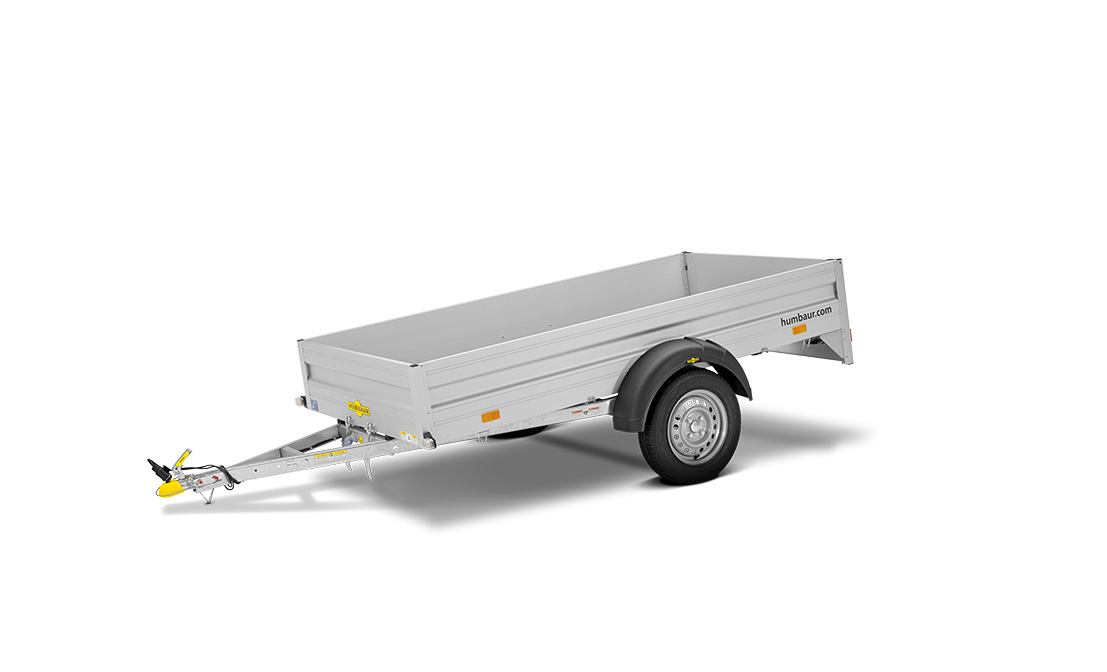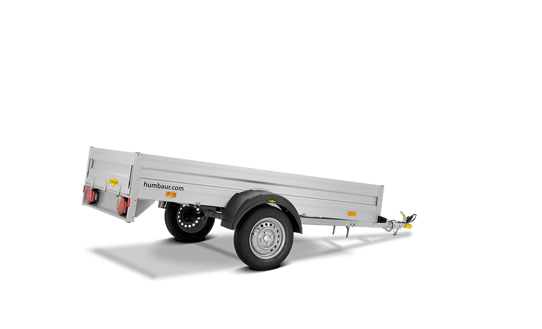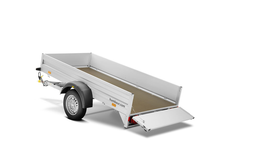 Gardening equipment and motorcycles can, for example, be transported more easily if the trailer tilts. For these and similar applications we equipped the HA flatbed trailer with a tilting body in this variant. A shock absorber simplifies the tilting process. Reinforcing ribs and additional hinges at the rear flap, for example, make the trailer particularly sturdy.