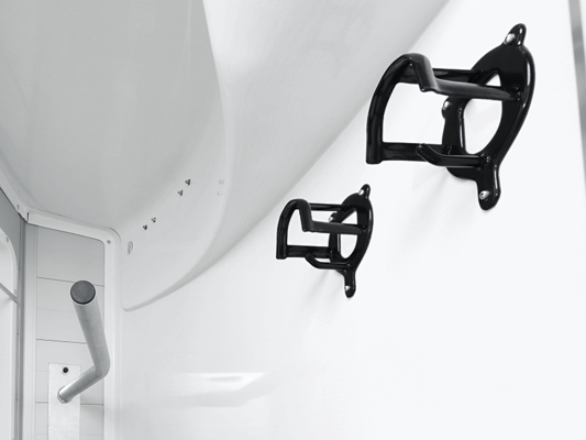 - Afsluitbare zadelkamer met zadelsteun, hoofdstelhouder, spiegel en opbergnet, binnenverlichting, schep en bezem