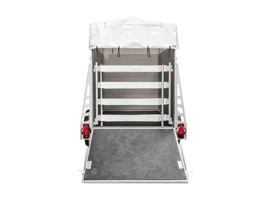 De nieuwe wendbare eenassige veetrailer blinkt uit door een robuuste opbouw van dubbelwandige, geanodiseerde aluminium profielen. Zijn chassis biedt door zijn thermisch verzinkte chassis een hoge stabiliteit en daardoor uitstekende veiligheid. Voor een veilige stand tijdens de rit zorgt de verlijmde en verzegelde rubbervloer. Een grote instapdeur bevindt zich aan de linkerkant van de aanhangwagen. De aanhangwagen is met een robuust dekzeil en bogen uitgerust.